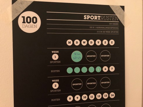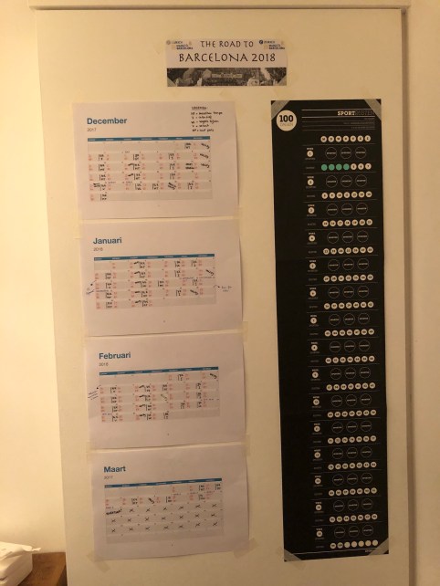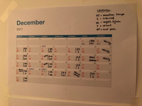 Zelf heb ik er nog een meer uitgebreide kalender naast gehangen, waar voor de komende 100 dagen precies staat uitgeschreven welke dagen ik welke afstand op welk tempo moet lopen (marathon tempo, intensief, vogels kijken of voluit). Dit alles gecombineerd met m’n volleybaltrainingen en -wedstrijden, feestdagen en weekendjes weg. Ook houd ik daar m’n dagelijkse hartslag in rust op bij om te zien of ik voldoende herstel tussen de trainingen door en niet overtraind raak.