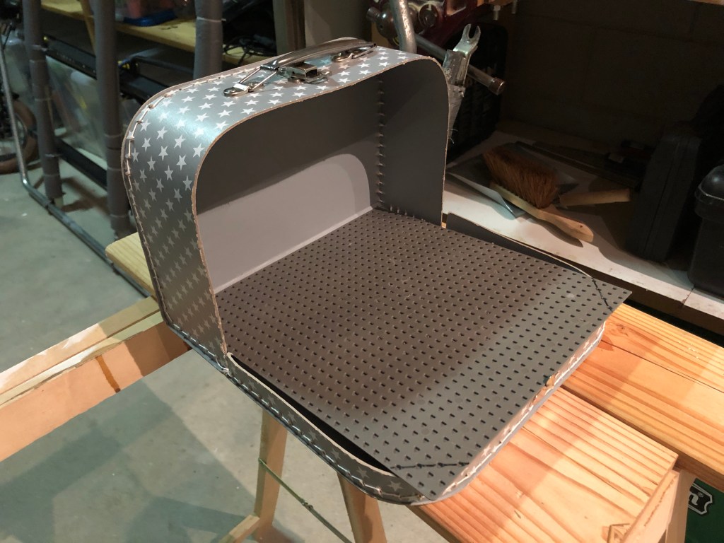 - Zaag ook de hoekjes af, zodat de plaat in de (afgeronde) deksel van de koffer past.