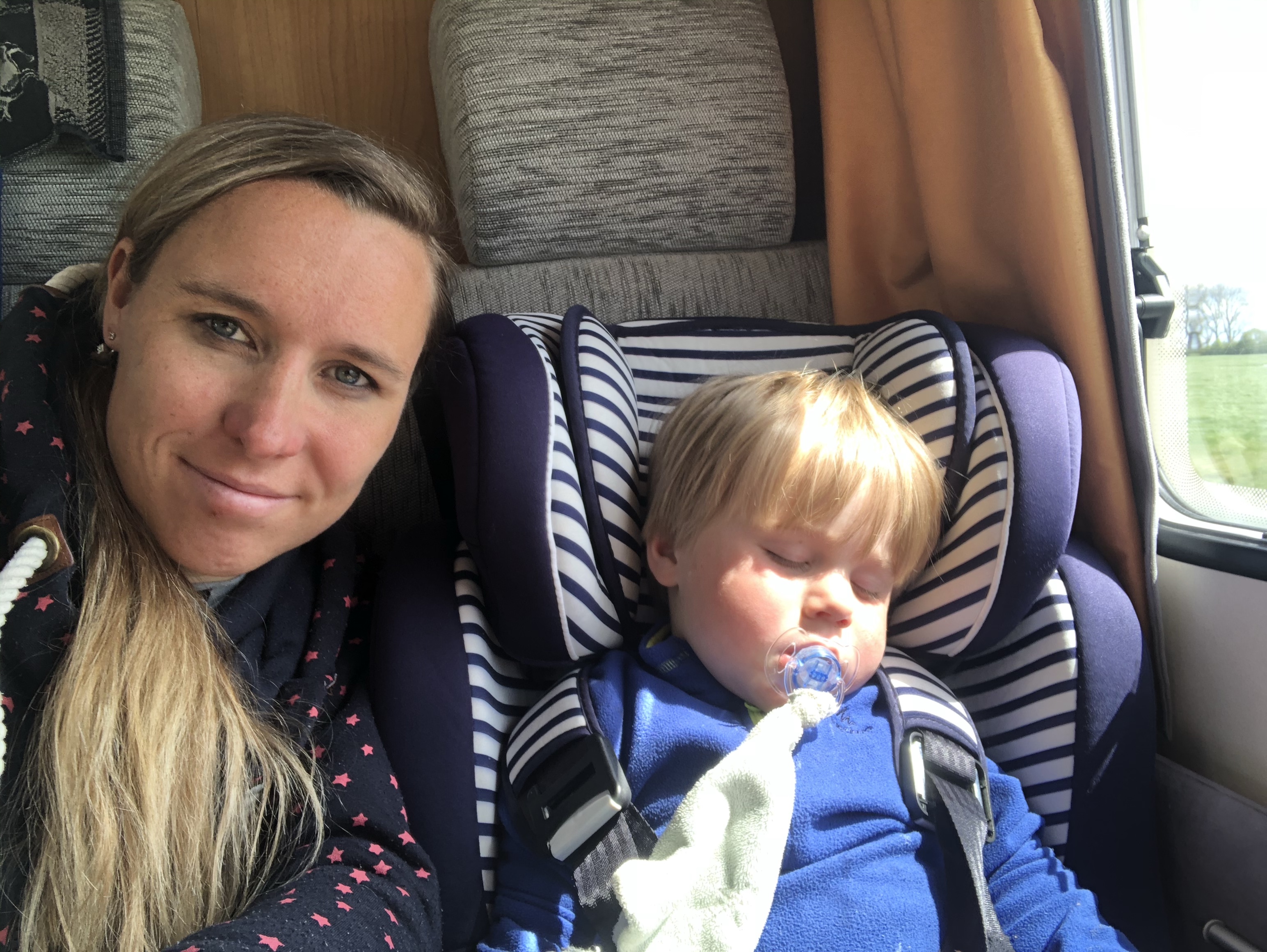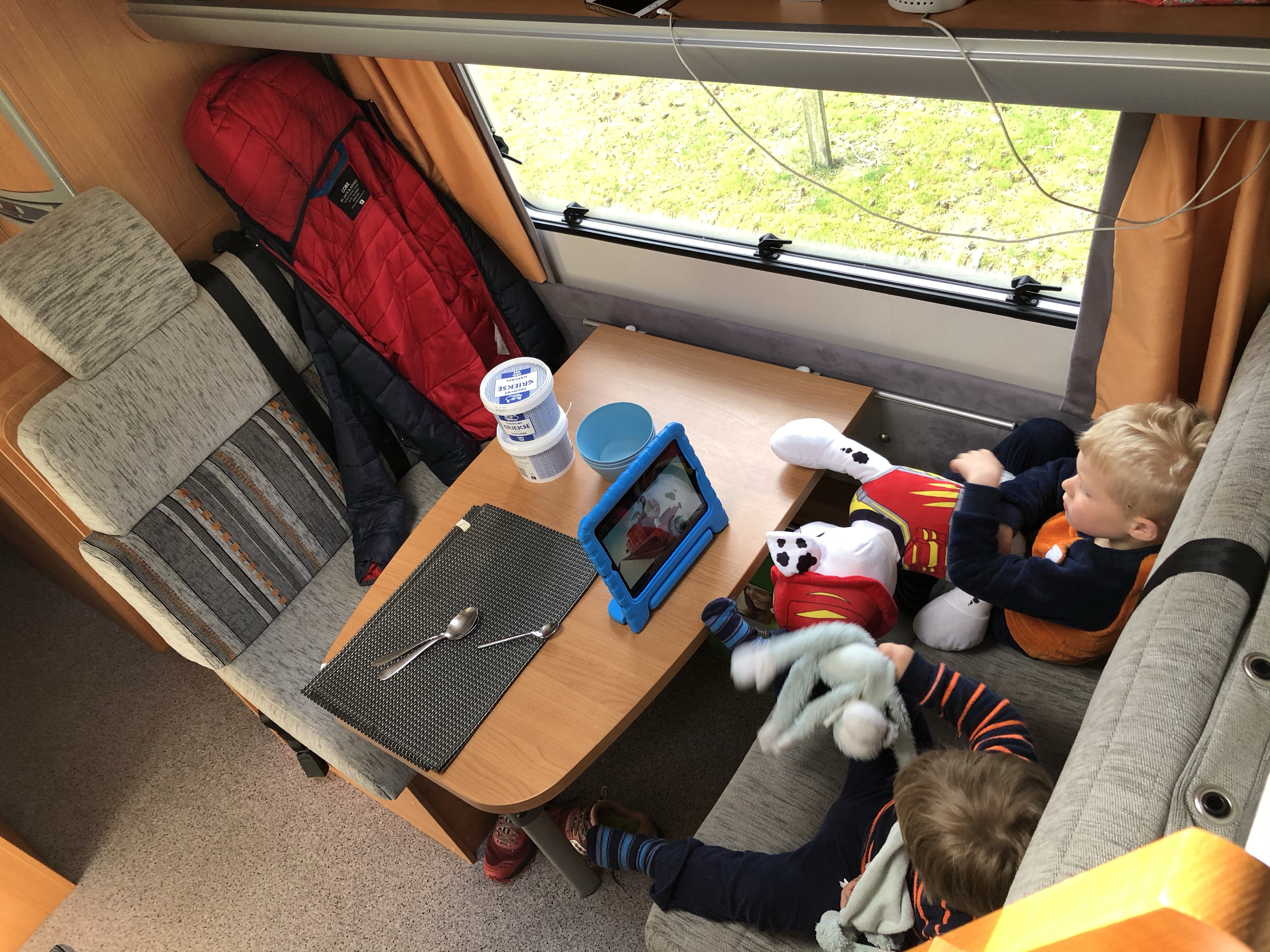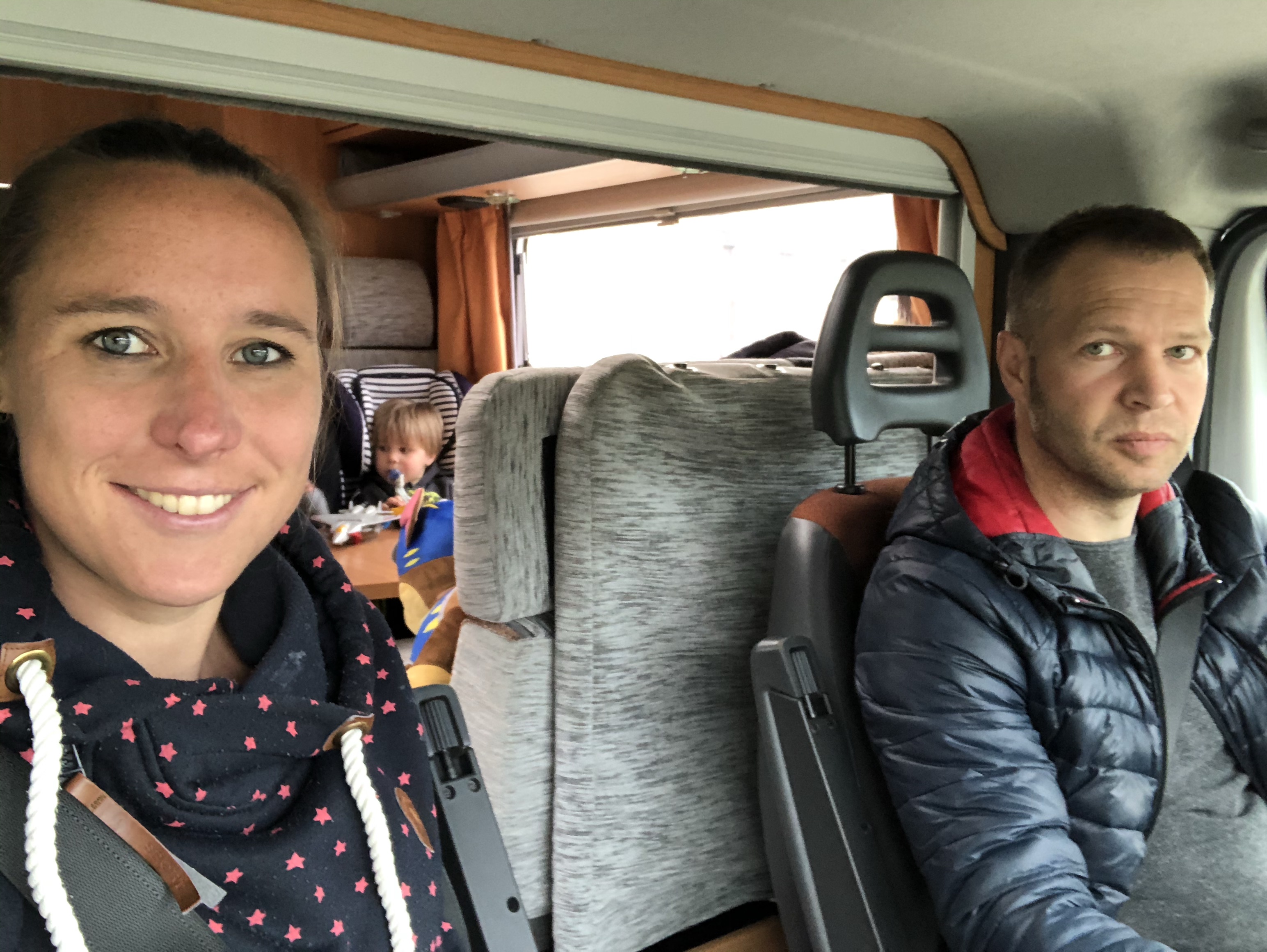 Het rijden in de camper was top! Zowel voor onszelf was het leuk om zo’n bakbeest te besturen, maar ook voor de kinderen is het super leuk. De eerste rit zaten ze samen in de zithoek aan de eettafel, waar ze alle ruimte hadden om aan tafel te spelen (wel zorgen dat ze het speelgoed even vast houden als je een scherpe bocht door gaat), of een dutje te doen. Ze zaten in hun kinderstoelen, dus hoog zat om lekker uit het raam te kijken. Zelf kon ik tijdens het bijrijden als het moest even naar achteren lopen om ze te helpen of iets voor ze te pakken. Later in de week zat Jelle voorin in zijn kinderstoel op de bijrijdersstoel en zat vriendlief of ik naast Mees achterin. Zelfs tijdens een rit van ruim 4 uur gaven ze beiden nauwelijks een blijk van verveling. Het scheelde ook dat we via de Bluetooth radio kinderdisco op hadden staan.