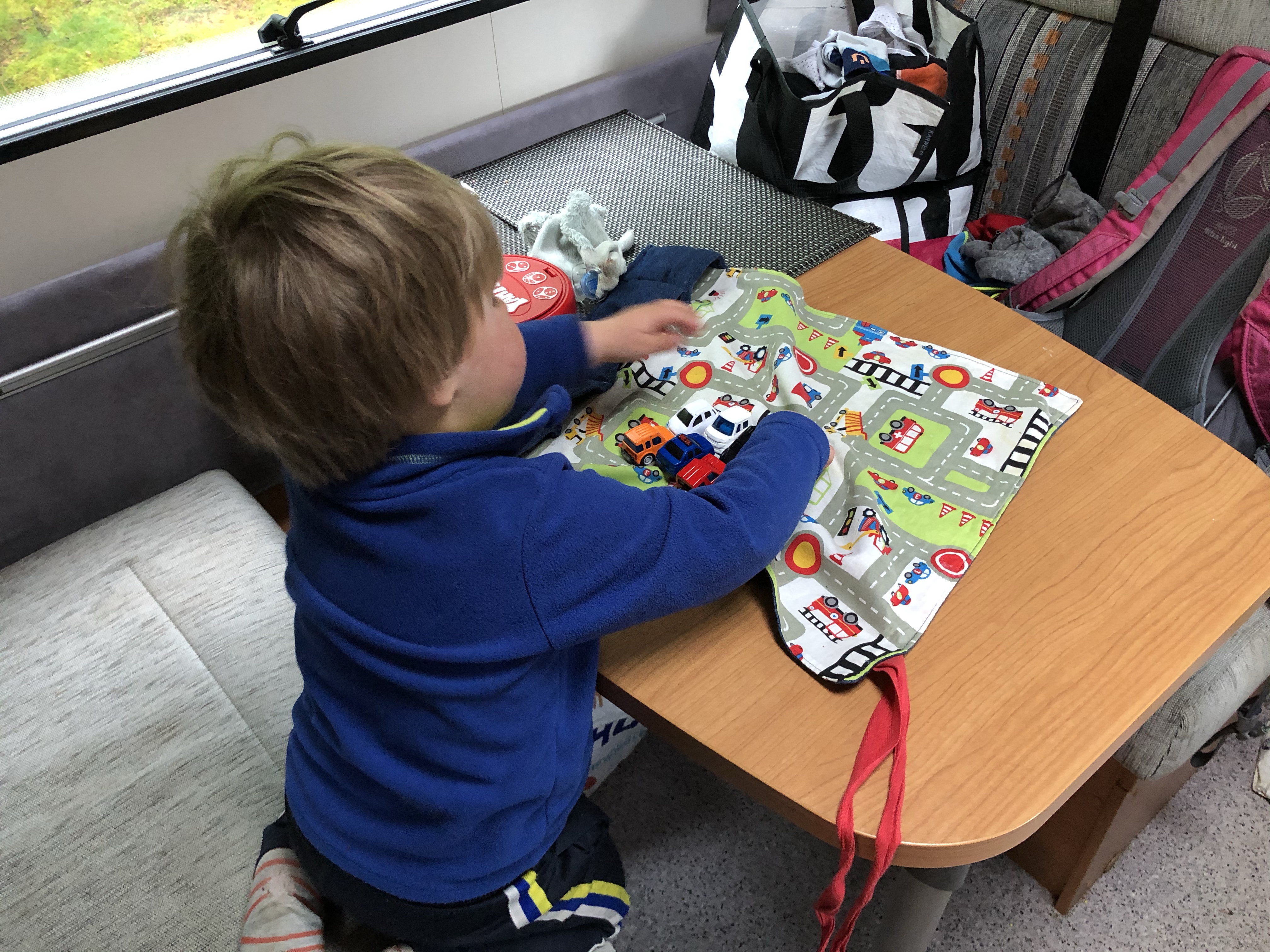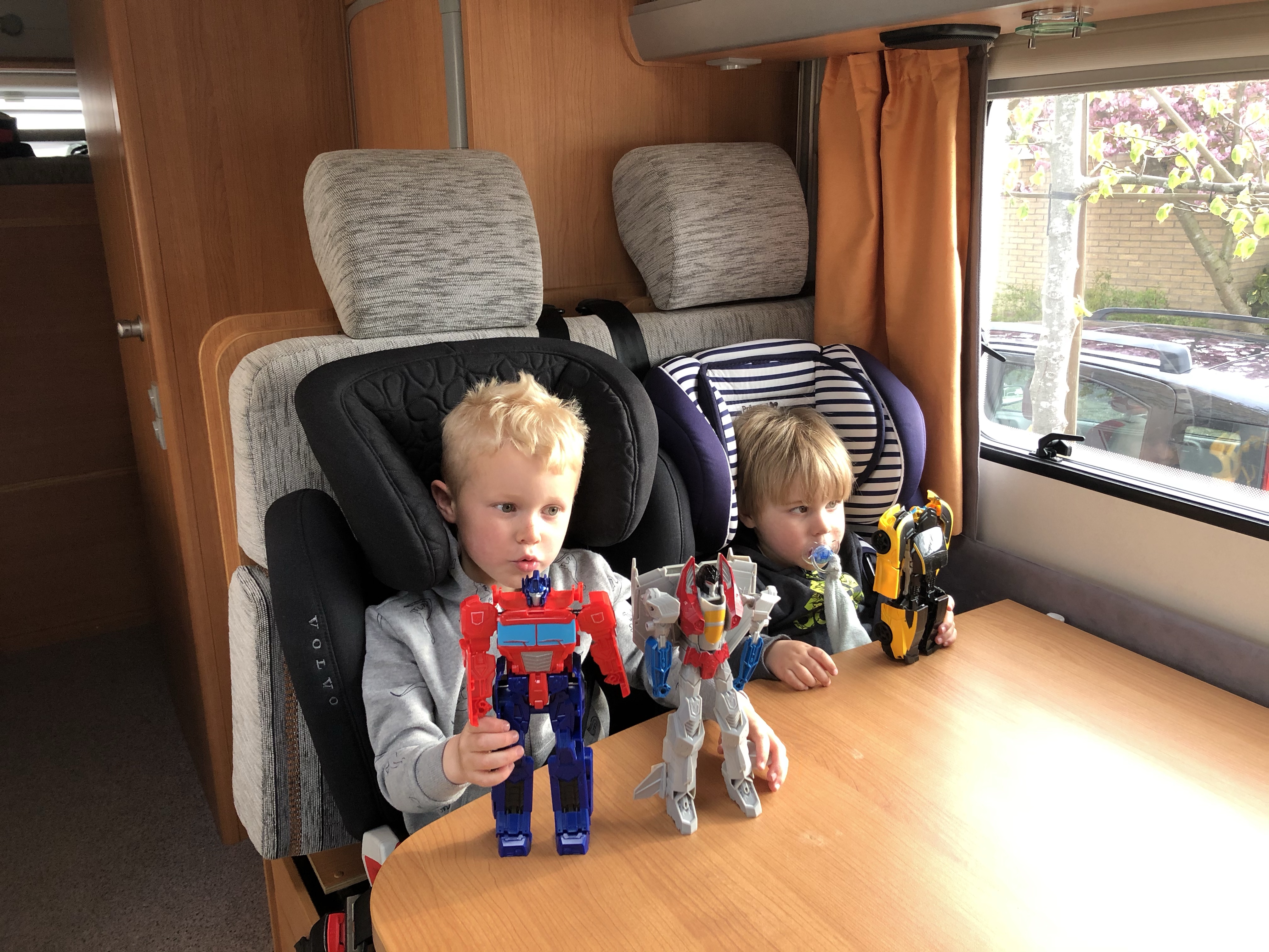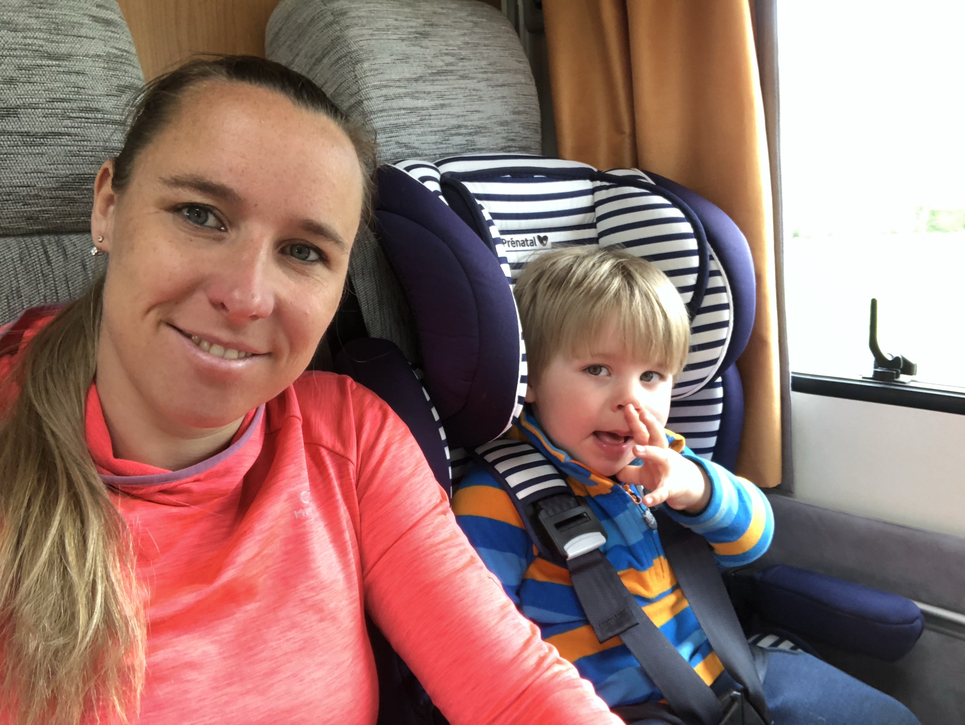 Het rijden in de camper was top! Zowel voor onszelf was het leuk om zo’n bakbeest te besturen, maar ook voor de kinderen is het super leuk. De eerste rit zaten ze samen in de zithoek aan de eettafel, waar ze alle ruimte hadden om aan tafel te spelen (wel zorgen dat ze het speelgoed even vast houden als je een scherpe bocht door gaat), of een dutje te doen. Ze zaten in hun kinderstoelen, dus hoog zat om lekker uit het raam te kijken. Zelf kon ik tijdens het bijrijden als het moest even naar achteren lopen om ze te helpen of iets voor ze te pakken. Later in de week zat Jelle voorin in zijn kinderstoel op de bijrijdersstoel en zat vriendlief of ik naast Mees achterin. Zelfs tijdens een rit van ruim 4 uur gaven ze beiden nauwelijks een blijk van verveling. Het scheelde ook dat we via de Bluetooth radio kinderdisco op hadden staan.