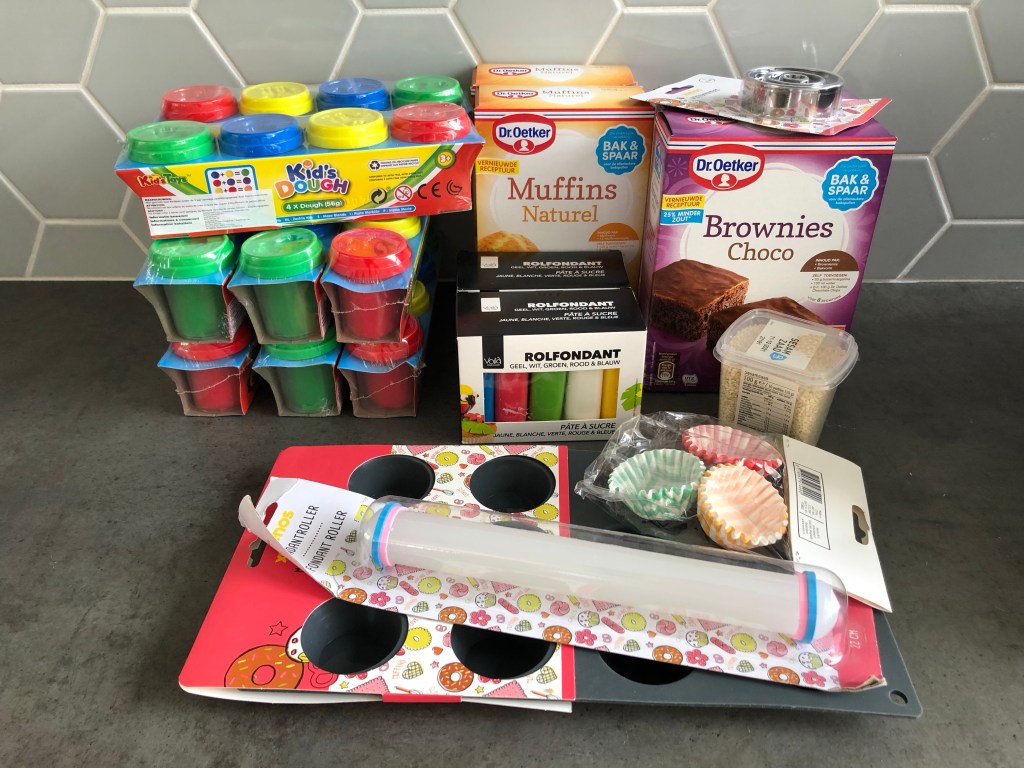 Ik besloot zelf voor mini-cupcakes te kiezen, omdat dat al meer dan genoeg is voor een kindertraktatie op school. Een potje klei erbij (4 potjes voor €1,30 bij de Wibra) en klaar! Vanwege de geldende Coronamaatregelen (geen zelfgemaakt eten uitdelen), moest het setje ook ingepakt worden. Wat eigenlijk wel prima was om het makkelijk uit te kunnen delen in de klas. Dus kocht ik nog snel even hersluitbare plastic zakjes (16 zakjes voor €1,00 bij de Wibra). Nog mooier kun je ze inpakken met rollen cellofaan folie (5 meter voor €0,50 bij de Action), maar dat koste mij iets teveel tijd.