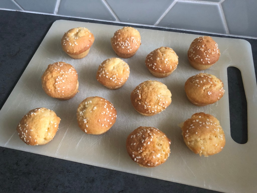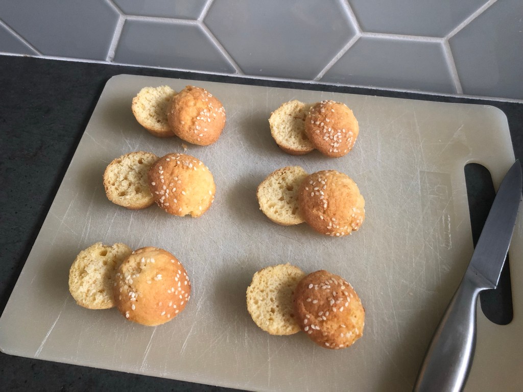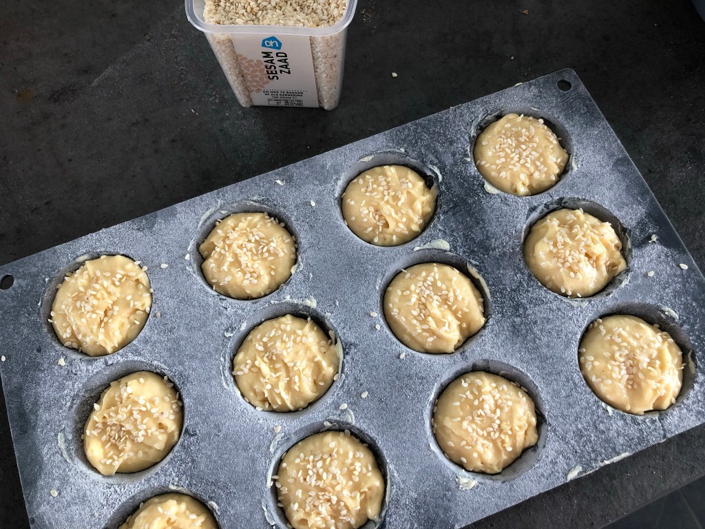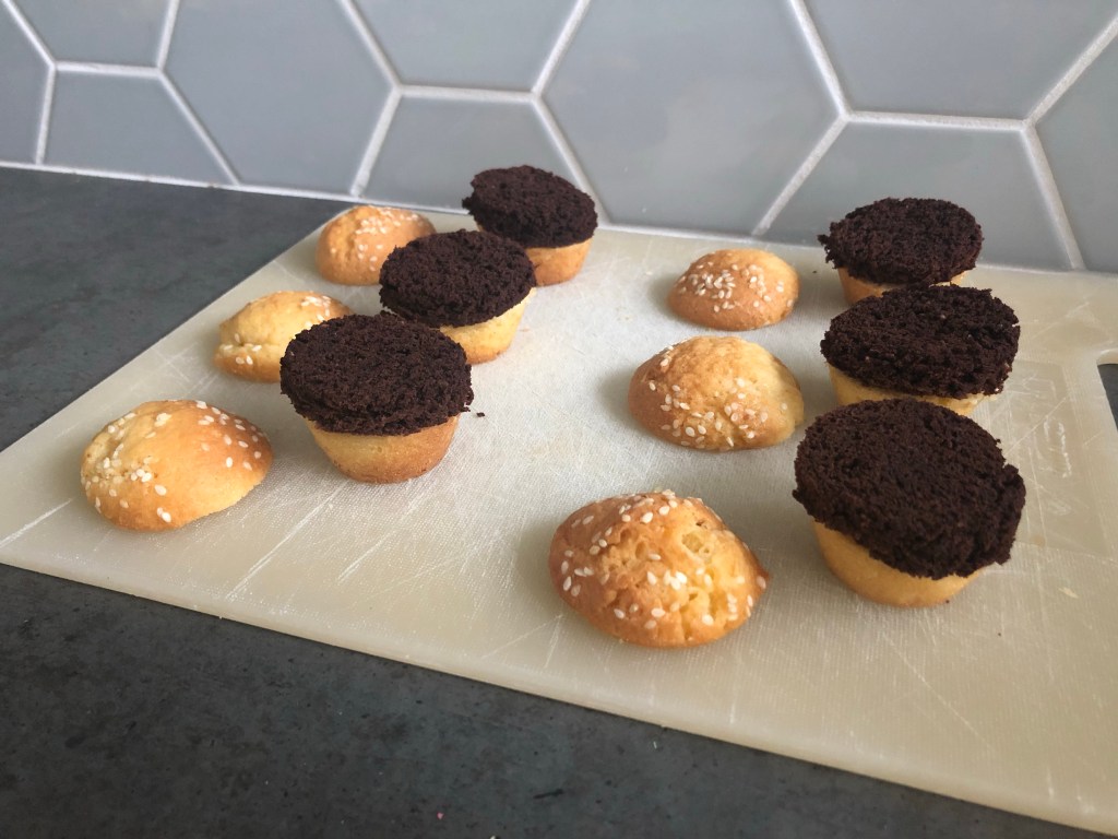 - Bak de cupcakes volgens het recept. Je bakt de cupcakes niet in papieren vormpjes maar gelijk in de cupcake vorm. Zelf gebruikte ik een siliconenvorm die je niet hoeft in te vetten, een blikken vorm kun je beter even invetten en bestuiven met bloem zodat ze makkelijk loslaten. Strooi ook wat sesamzaadjes over de cupcakes voordat je ze bakt. Halveer de cupcakes na het afkoelen met een mes.
