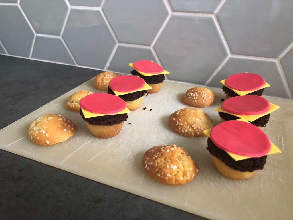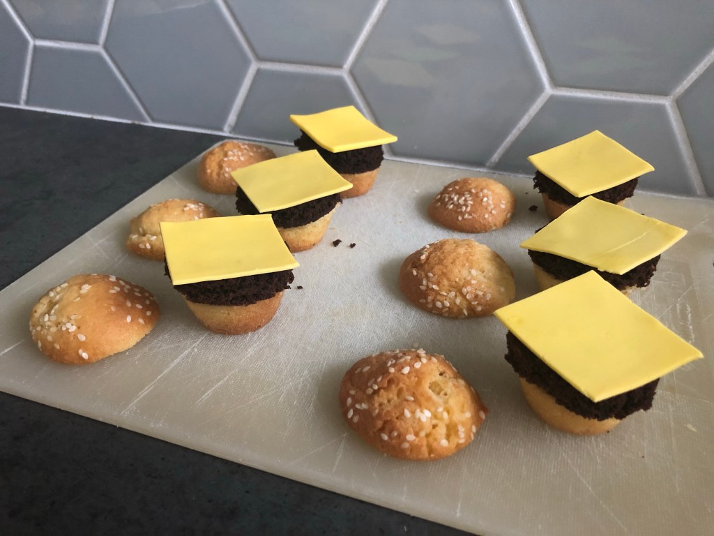 - Voor de hamburger gebruikte ik voor het gemak een kant-en-klare mix. Snijd de brownie na het bakken (en afkoelen!) in lagen/plakken van ongeveer één centimeter dik. Neem een uitsteker van dezelfde grootte als het onderste deel van de cupcake. Ik gebruikte een whiskey glaasje met een doorsnede van ongeveer 5cm. Steek je hamburgers uit de brownie en leg deze op de cupcake.