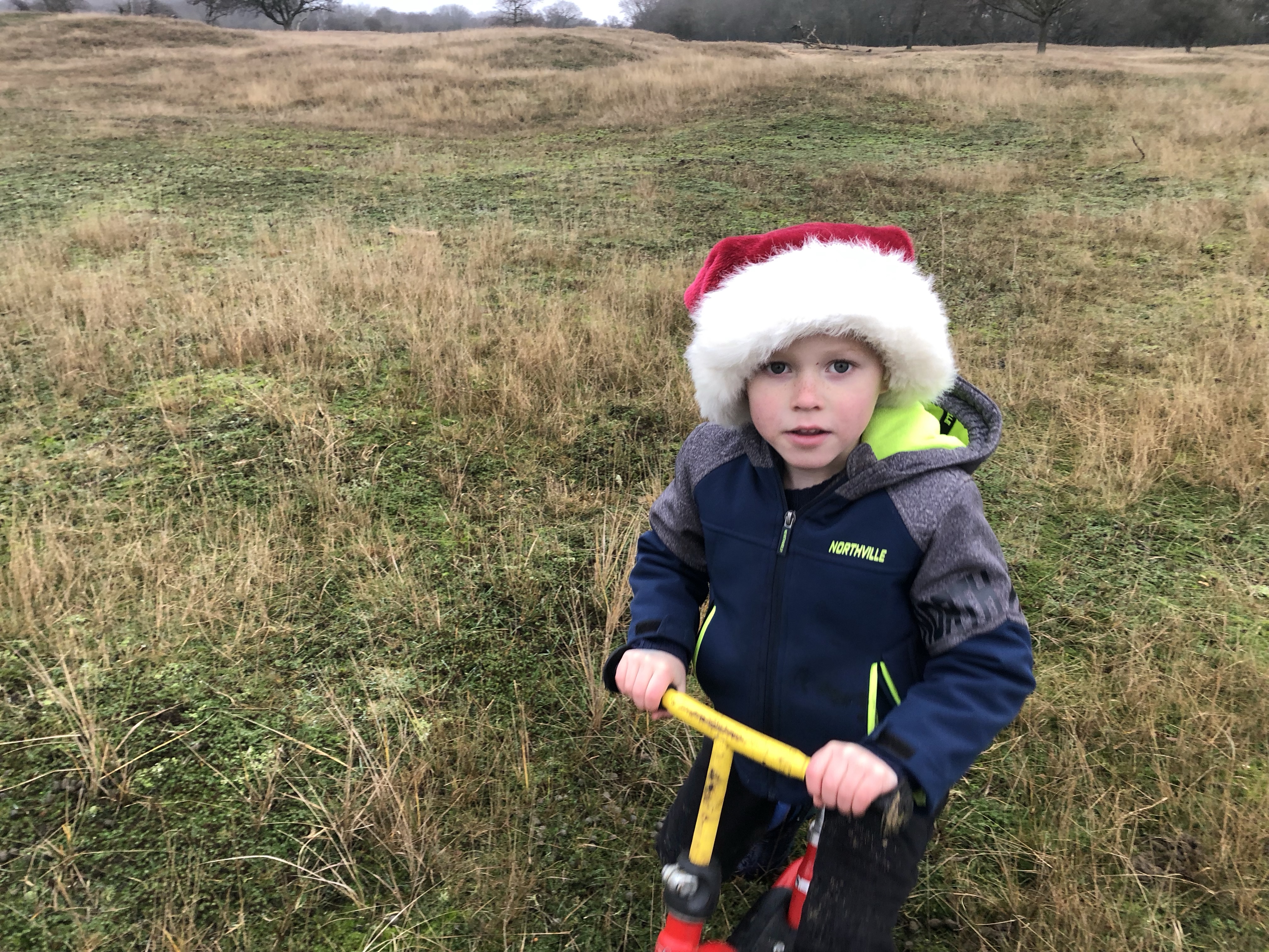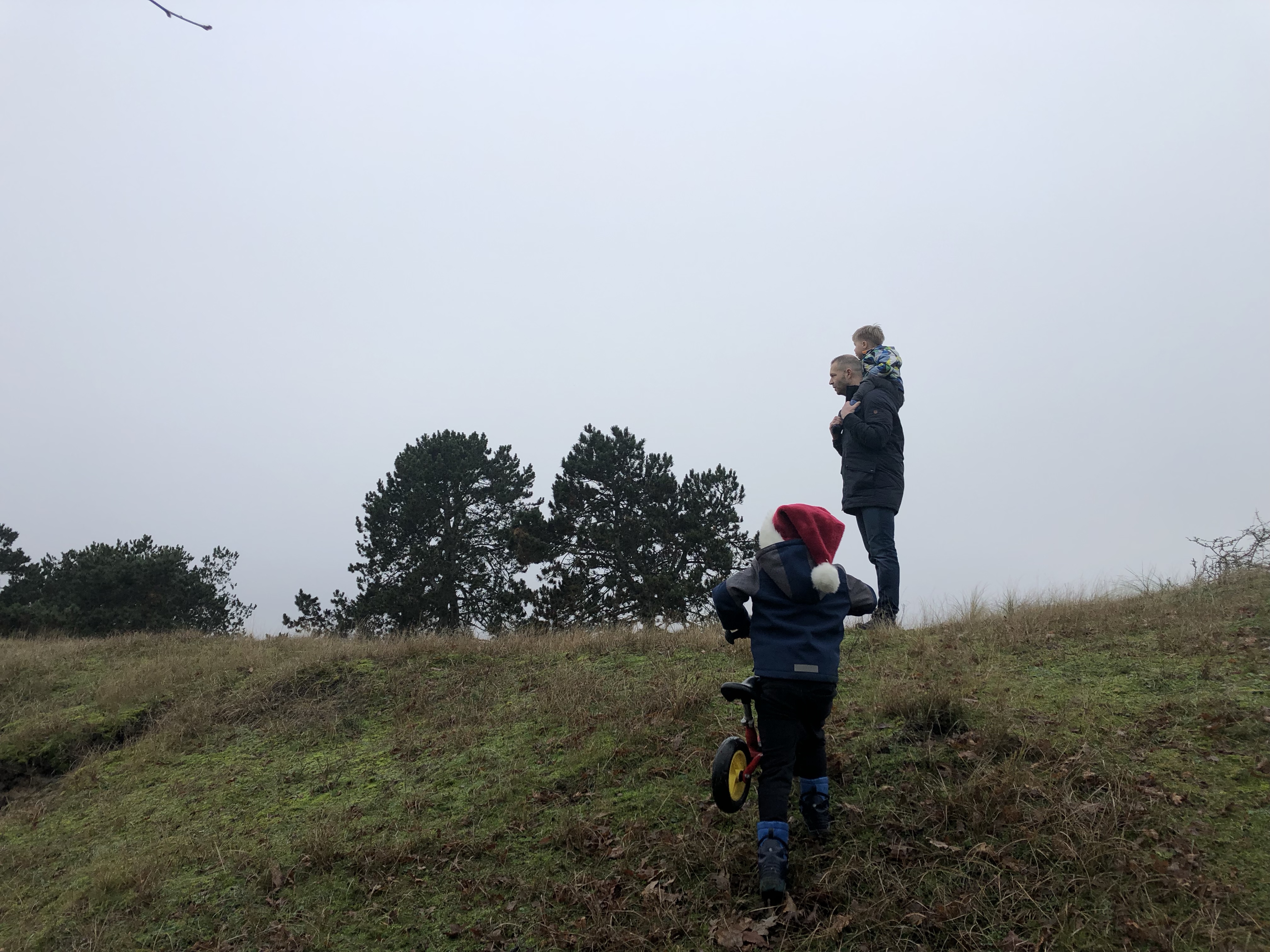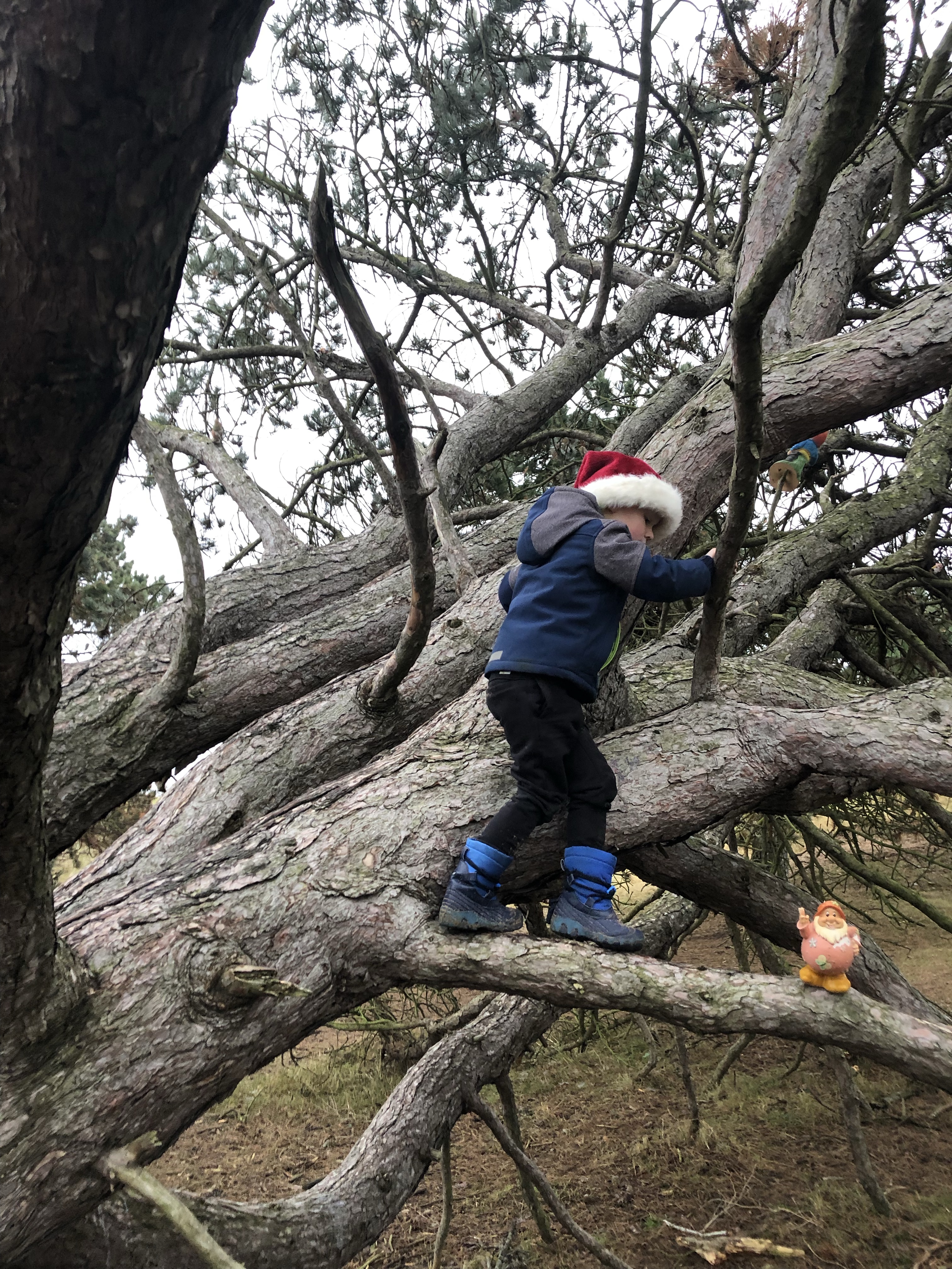 Er werden nog wat bomen beklommen door de mannen, Mees onthoofde het kabouteropperhoofd en ik maakte wat foto’s van de koddige kaboutertafereeltjes. Hoewel Jelle nauwelijks afscheid kon nemen van onze kabouter, moesten we op een gegeven moment toch weer huiswaarts. Een stukje door de duinen, om via hetzelfde verharde pad weer terug naar de parkeerplaats te gaan. De heuvel waar Mees op de heenweg net niet van z’n fietsje afzwabberde, bleek vanaf de andere kant toch wat verraderlijker. Zo kom je altijd voor verassingen te staan op expeditie. Daar ging hij met een noodvaart en eindigde beneden met z’n fietsje op de grond. Ik had de renpas halverwege al ingezet en was dus snel bij hem toen het leed geschiedde. Het bleek gelukkig slechts een bloedneus en een schram op z’n voorhoofd, dat had een stuk ernstiger af kunnen lopen..