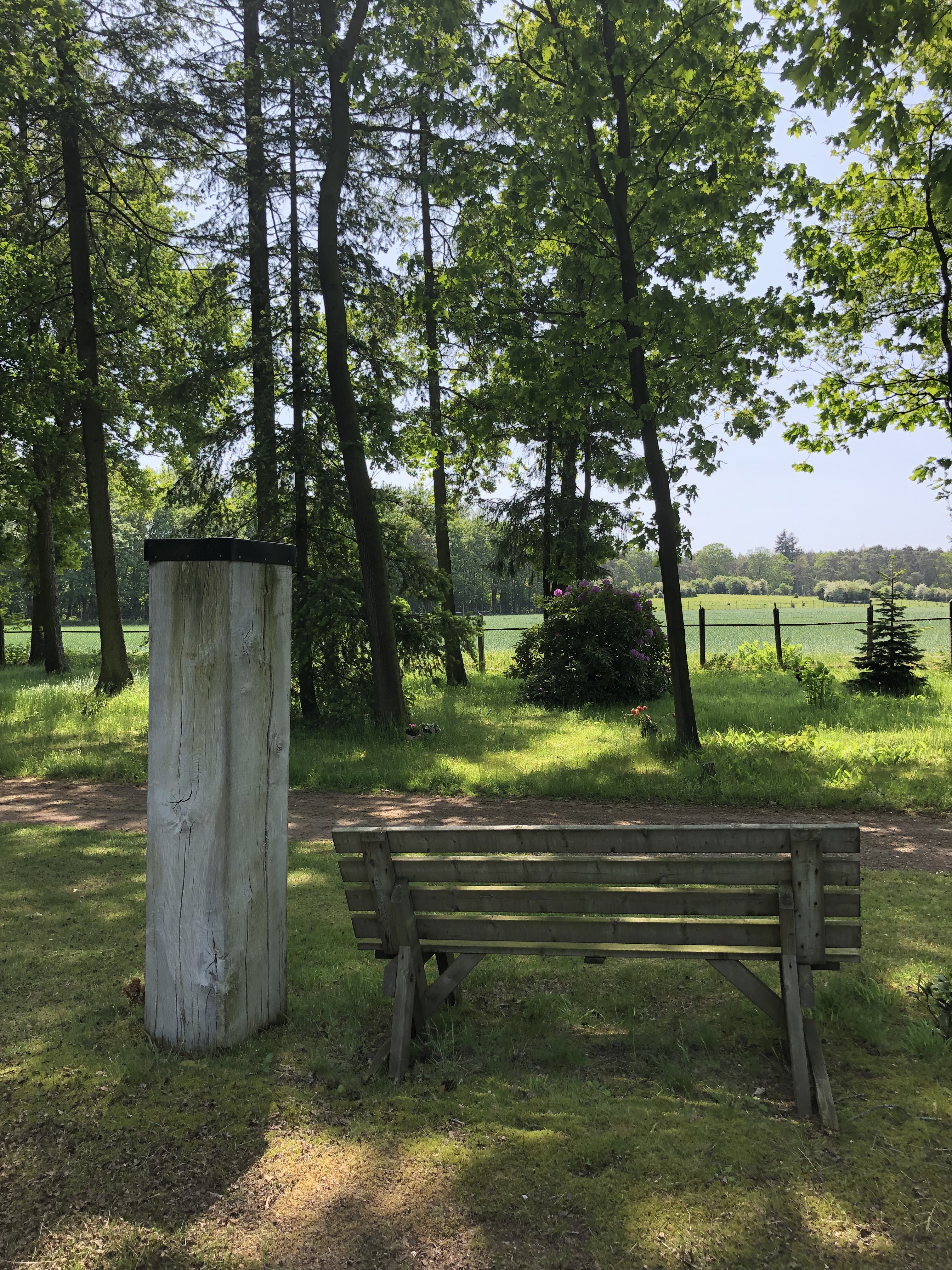Ik zoek een mooie plek dichtbij een bankje en besluit het kleine beetje as dat ik bij me heb uit te strooien. Ik twijfel nog even om met papa te overleggen, met zuslief kan niet meer, maar uiteindelijk ben ik degene die nog heel veel jaren (en uiteindelijk alleen) verder moet met dit verlies. Ben ik degene die waarde hecht aan een fijne plek waar ik mama zo nu en dan eens kan opzoeken, al is het dan nu maar een klein stukje van haar. Ik denk dat ik die fijne plek vandaag gevonden heb. Naast een grote paarse rododendron, die vol in bloei is. Dichtbij een bankje, met een vergezicht over een weiland, waar ik kan gaan zitten om herinneringen op te halen als ik daaraan toe ben. Alleen, met papa, of met andere fijne mensen.