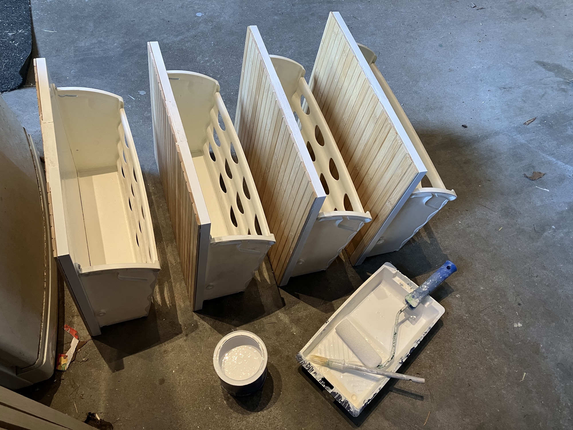 - Gebruik Pattex Power Fix om de stukjes opvulhout en de bamboe op de lades te bevestigen. Ik legde de lades daarna op z’n kop en legde er een paar zware boeken in, zodat de plankjes mooi strak op de lades opdroogden.