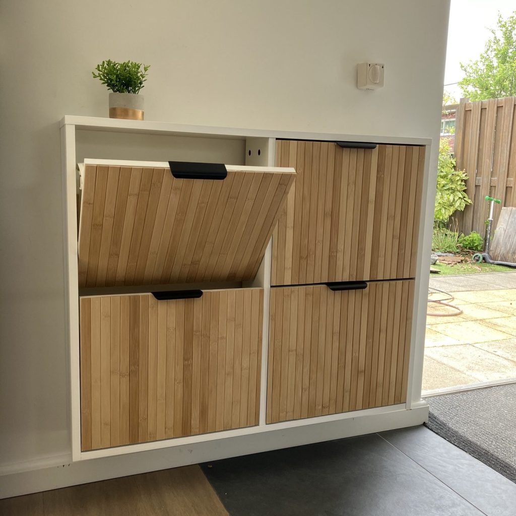 We hadden een open schoenenkast bij de achterdeur. Zo’n bankje met een kussen erop en vakjes eronder. Op zich best handig, zeker om er schooltassen, jassen en andere attributen op te kunnen deponeren bij het thuiskomen van de kids. Maar omdat hij aardig in het zicht stond – met schoenen die zichtbaar in het kastje gepropt waren en tassen die er klakkeloos op gedeponeerd werden – vond ik het een lelijk tafereel.