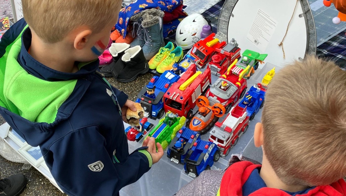 Jelle had iets meer moeite om iets leuks te vinden. Ik zei dat het geld desnoods bij thuiskomst in de spaarpot mocht, maar dat wilde hij toch liever niet. Opeens zag hij opnieuw een step, een heuse stuntstep dit keer voor €10. De man van het kleedje hield zijn verkooppraatje, ik zei nog “van een oud vrouwtje geweest zeker ;)” wat de beste meneer niet helemaal begreep, maar Jelle was al om. Nog €5 over dus. Mees vond ondertussen een groot huis van Robocar Poli. Ik weet nog dat ik 2 jaar terug spijt had toen ik bij eenzelfde huis van Brandweerman Sam weggelopen was, dus ik vond het al snel prima. Terwijl het jongetje hem liefst voor €12 verkocht, stond zijn vader erop dat hij maar €6 hoefde te kosten. Zelf had ik er zo €12 voor gegeven, dus werd het €7. Mees sjouwde vol trots rond met de emmer met zelf gescoord speelgoed.
