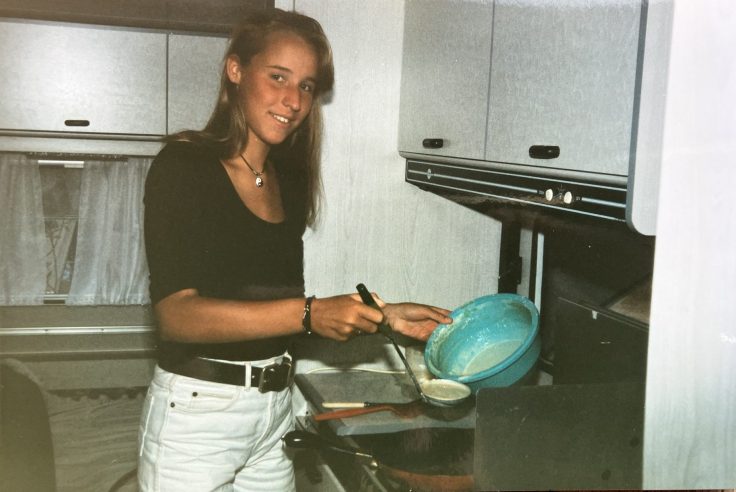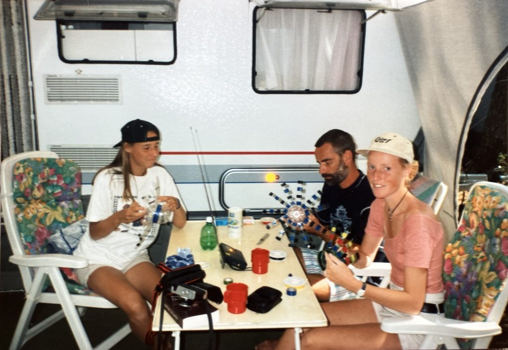 Onze vakantie in Lacanau is er één waar ik bovengemiddeld veel herinneringen aan heb. Misschien wel alleen vanwege de foto’s die mama zorgvuldig in mapjes – gesorteerd op jaartal – bewaarde (naar mijn gevoel komen veel herinneringen aan vroeger vooral vanwege foto’s), maar misschien ook omdat het echt een fijne vakantie was. Windsurfen met papa op Lac de Lacanau, het meer waar de camping aan lag. Elke ochtend verse broodjes halen bij de bakker, net zo vaak totdat zuslief en ik alleen durfden te gaan met een handjevol Franse Franken. Zeker eens per week stond ik samen met mama in een ouderwetse, krappe en bloedhete telefooncel bij de receptie om oma te bellen, toen nog met een buitenlandse belkaart met beperkt beltegoed. En windmolentjes maken met papa in de voortent, van lege waterflessen en gekleurd klustape, want klusspullen had mijn vader altijd wel mee.
